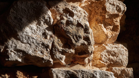 A beautiful close-up of a textured stone wall illuminated by natural light, creating intriguing shadows that enhance the warm tones, ideal for interior aesthetics.