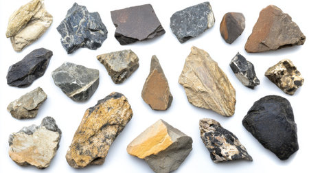 A diverse assortment of rocks and minerals displayed on a clean white background, showcasing textures and natural forms for artistic and educational applications.
