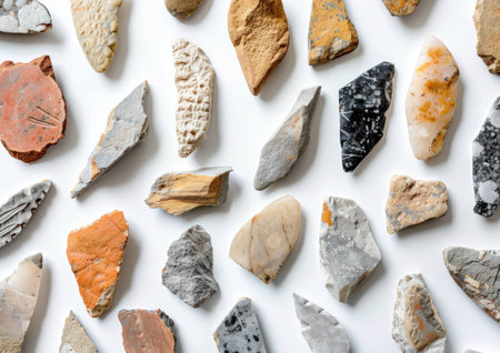 Collection of various shaped stone artifacts arranged neatly on a white background, showcasing diverse textures and patterns. Archeology and history concept.