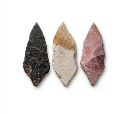 Display of ancient stone arrowheads showcasing various shapes, colors, and textures. Ideal for educational purposes or as a fascinating look into prehistoric craftsmanship.