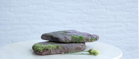 Flat natural stones with sprouted moss on white wall background. Abstract minimal scene with podiums. Mockup template for product.