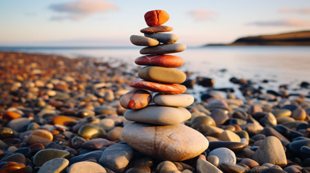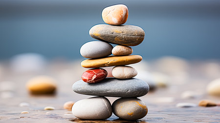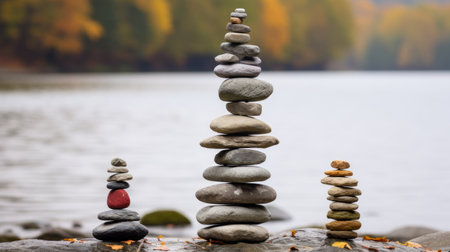 AI Generated. a stack of smoothe pebble stones by a serene lake
