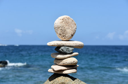 Stacked zen stones and tumbled coral balanced by breathtaking ocean.
