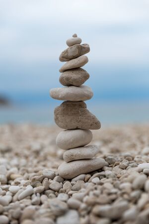 Stones pyramid on pebble beach symbolizing stability, zen, harmony, balance. Shallow depth of field