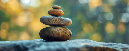 Two stacks of smooth stones on a wooden beam symbolize balance and tranquility, perfect for wellness and mindfulness themes in various designs.