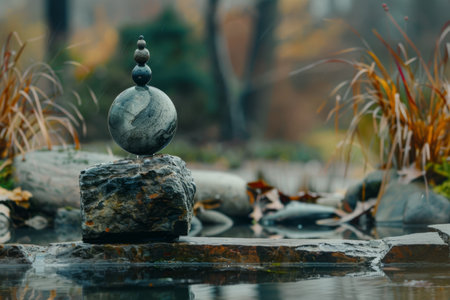 A balanced arrangement of stones is the central subject of this photograph, resting in water. The scene features a tranquil body of water, with surrounding trees and a blurred background. The composition uses muted colors, suggesting a calm atmosphere. The image could be used for wellness, meditation, or environmental themes in various media.