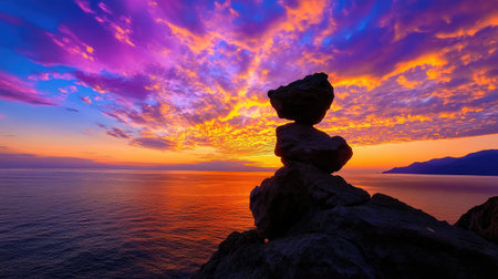 A carefully constructed stack of smooth stones stands in perfect balance on a rugged cliff, a symbol of stability and mindfulness against the backdrop of restless ocean waves. This serene scene captures a moment of peace and harmony found in natures raw beauty.