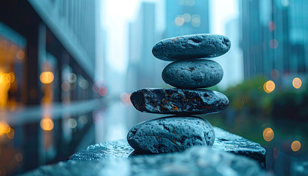 Stack of zen stones in the city. 3d rendering.