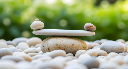 A close-up shot captures a delicate arrangement of smooth, grey and white stones meticulously balanced, evoking a sense of tranquility and inner peace.