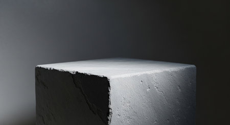A rough textured gray stone cube pedestal with dramatic lighting casting shadows on its surfaces against a dark background.