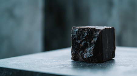 A minimalist dark stone block rests on a gray surface, illuminated by soft light, creating gentle shadows and emphasizing texture and form. Ideal for artistic projects.