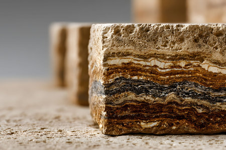 Close up of a layered rammed earth cube showcasing natural soil strata and earthy tones
