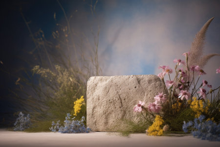 An AI-generated illustration of a grey concrete block with vibrant blooming flowers.