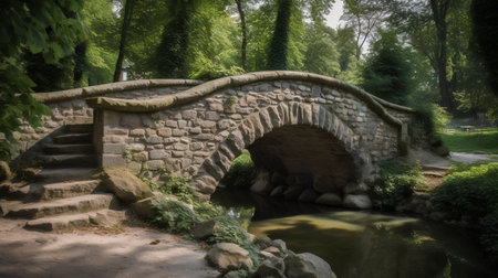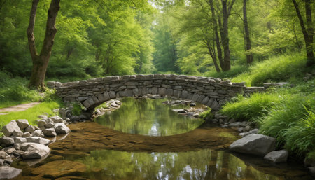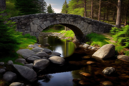 stone bridge crossing over babbling brook, with view of the forest beyond, created with generative ai