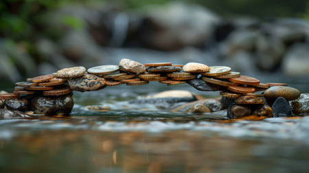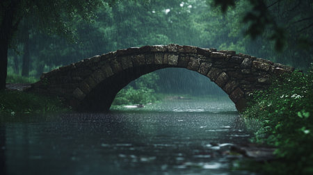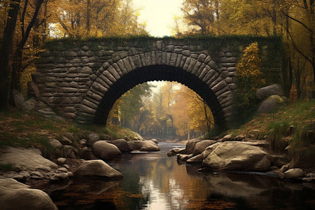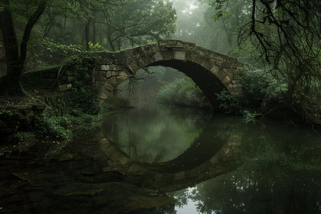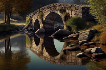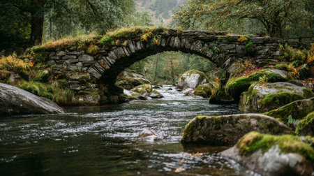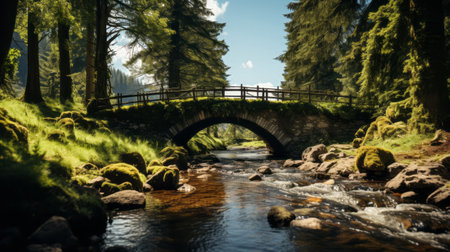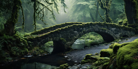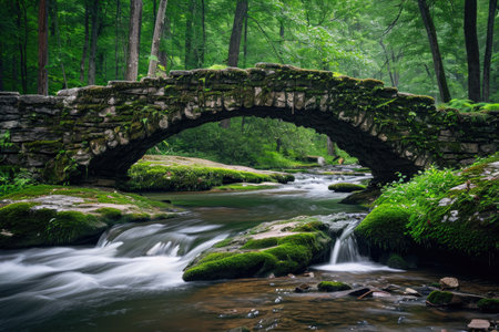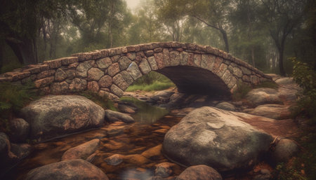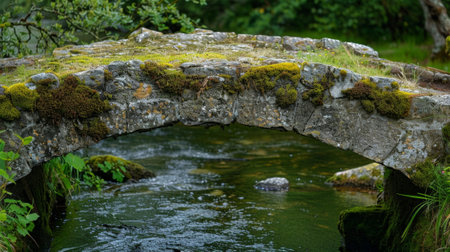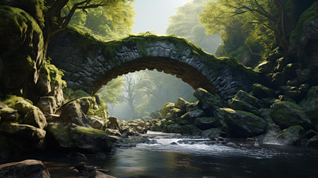 An old stone bridge spans a gurgling stream its cracked and mosscovered surface serving as a reminder of the countless journeys taken . AI generation