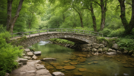 A picturesque stone bridge arches over a gentle stream in a dense, mystical forest. Lush green foliage, moss-covered rocks, and filtered sunlight create a serene and enchanting scene. The flowing water adds a sense of tranquility.