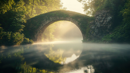 Majestic stone bridge arching gracefully over a tranquil misty lake in an enchanting forest landscape the scene bathed in soft golden sunlight creating a serene and ethereal atmosphere