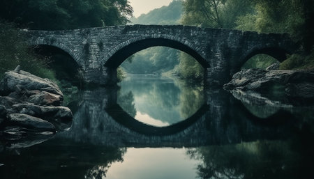 stone bridge over still water surrounded by lush greenery, created with generative ai