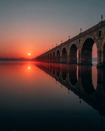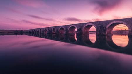 The colorful sunset casts a warm glow on the arches of an ancient bridge, creating stunning reflections on the still water beneath, enhancing the tranquil atmosphere around.