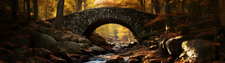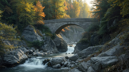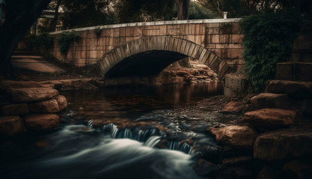 Tranquil scene of ancient stone bridge in autumn forest generated by artificial intelligence