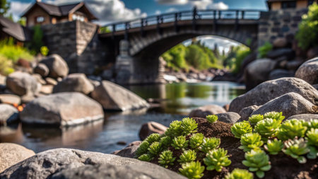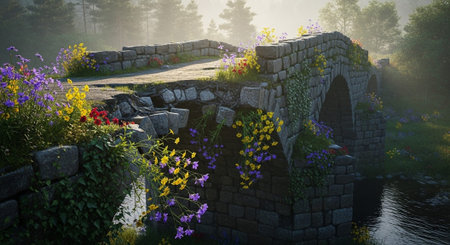 Serene stone bridge over babbling brook in lush meadow with wildflowers moss and butterflies