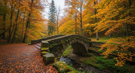 Stone bridge in the autumn forest with colorful trees and fallen leaves.