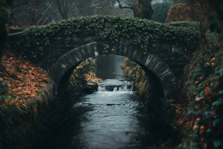Small waterfall flowing under an ancient stone bridge covered in ivy in a mysterious forest