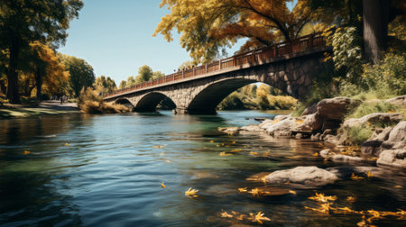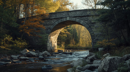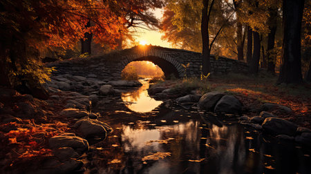Stone arch bridge over tranquil water in autumn forest landscape generated by artificial intelligence