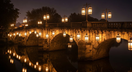 A serene evening scene featuring a stone bridge with illuminated arches reflecting in still water, creating a tranquil atmosphere perfect for urban exploration.
