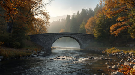 A tranquil autumn scene featuring an ancient stone bridge arching over a calm river. The vibrant orange foliage creates a captivating atmosphere amid gentle mist.