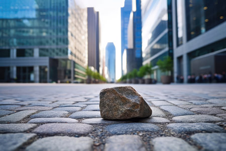 Close-up of a patterned rock on a cobblestone street with blurred city background