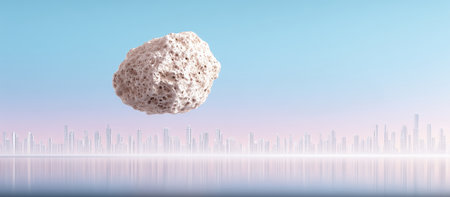 Porous rock hovers above tranquil water, with a pastel skyline in the background, creating a serene and surreal atmosphere that evokes natural beauty