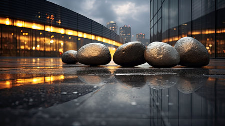 Closeup Of Rock On City Pavement Against Backdrop Of Unfocused Skyscrapers. Empty Display Case For Presentation Of Cosmetic Or Food Product