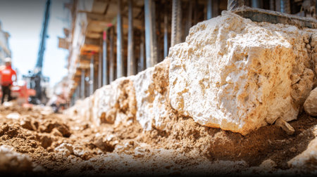 Workers build a solid stone foundation in an urban construction site surrounded by machinery and tools, ensuring long lasting support.