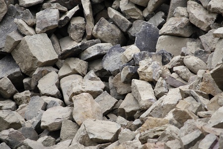Large crushed stone background. Gray gravel for the construction industry. Close-up. View from above. Selective focus.