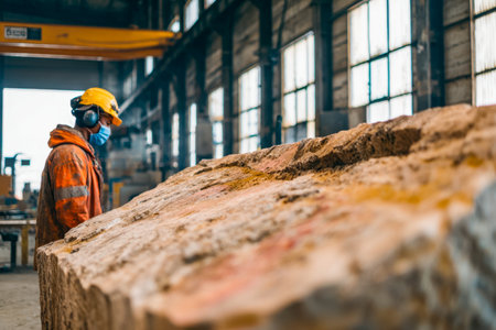 A skilled craftsman examines a massive timber plank, surrounded by the rugged interior of a lumber yard, emphasizing craftsmanship and industrial scale.