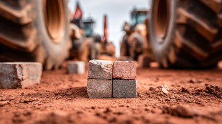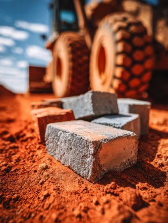 Aged bricks lie atop vibrant soil, with massive, out-of-focus tires hinting at ongoing construction under bright, sunlit skies on a bustling site.