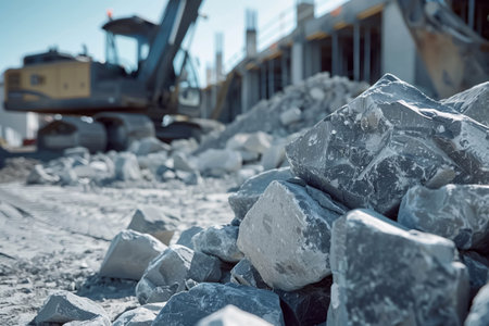A dynamic scene featuring a pile of rocks being chipped away, with dust and debris scattering in the air, highlighting the action and intensity of a construction site environment.