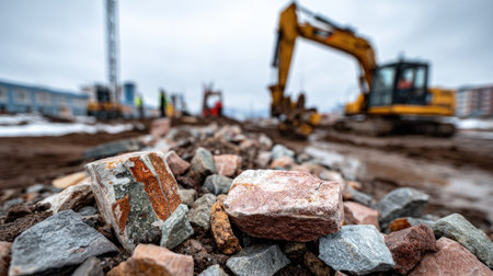 A detailed view of a construction site featuring heavy machinery and rocks scattered on the ground, highlighting the rugged landscape under a gray sky.
