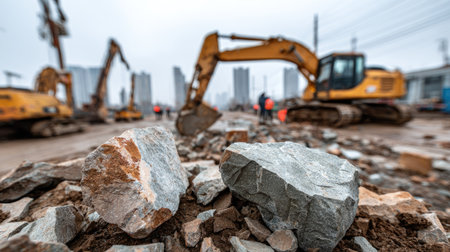 A dynamic scene showcasing heavy machinery, including excavators, at a construction site. The foreground features scattered rocks with blurred workers, emphasizing the industrial activity and environment.