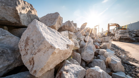 A stunning view of a stone quarry with large rocks illuminated by sunlight. Heavy machinery operates among the rocky landscape, showcasing the raw materials of the industry.