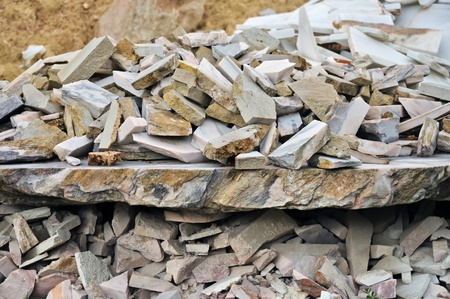 A low angle view, the rubble of large concrete blocks is piled up on the mounds of the demolition roads for renovations, with the daytime sky clouds in the background.