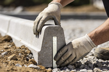 A gloved hand carefully places a concrete curbstone into position, securing it with a metal insert for road construction and landscaping projects