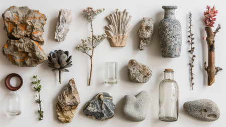Variety of objects, including rocks, a vase, and a glass. The arrangement of these objects creates a sense of balance and harmony, with the rocks and vase complementing each other in size and shape
