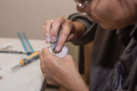 artisan molding a sculpture in clay and molding paste, on a table with several molding tools and brushes