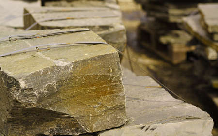 Stone masonry material on construction site. Industrial cobblestones for paving terrace, road or sidewalk. Building materials.