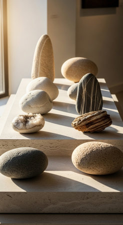 Collection of various smooth and textured stones; unique rock formations with warm sunlight and shadows on a stone surface