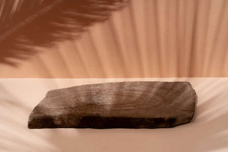 Podium made of natural stone with the shadow of a tropical leaf on the background for cosmetics, natural products. Beautiful background from natural materials