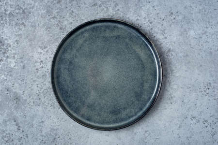 An empty plate on a gray concrete table. Top view.