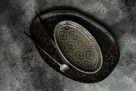 Table setting with a black plates on a black background. Minimalism concept.